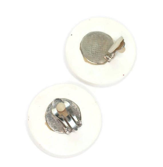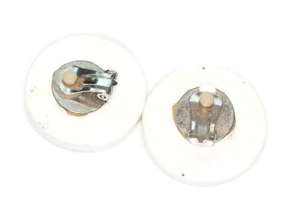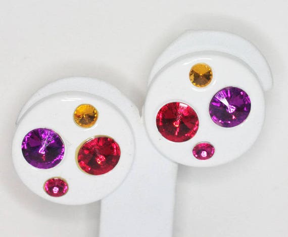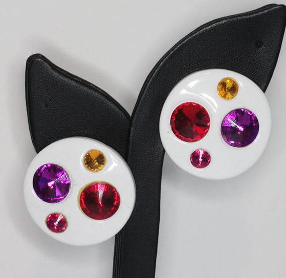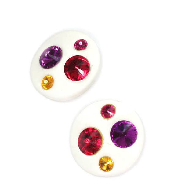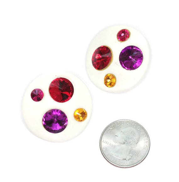 15% OFF coupon on White Lucite Rhinestone Earrings Multi Color Rivoli Stones Large Round Clip Ons by PastSplendors