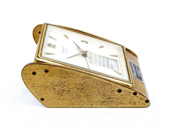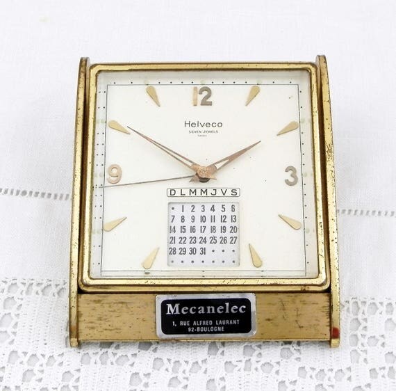 20% OFF coupon on Working Vintage Swiss Helveco Mid Century 7 Jewels Gold 1950s Mechanical Desk Clock Perpetual Calendar, Wind-up Clock, Retro, Desk, Office by VintageDecorFrancais