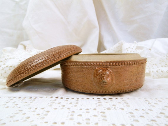 Vintage French Stonware Salt Glazed Trinket Box with Lions Heads / French Rural Decor / Country Decor / Ceramics / European / Retro Home by VintageDecorFrancais
