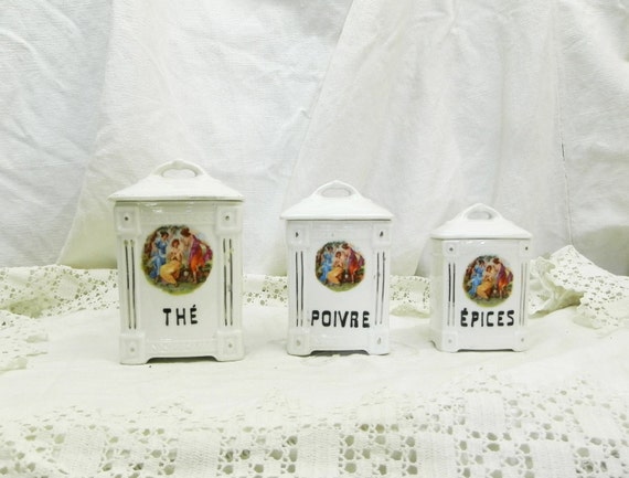 Antique French China 3 Piece Canister Set, French Country Decor, Kitchenalia, Retro Vintage Home Interior, Kitchenware, Porcelain Caniste by VintageDecorFrancais