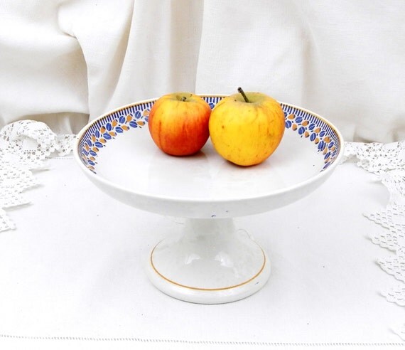 Antique French Porcelain Cake Stand White with a Simple Blue and Yellow Motif, French Country Decor, Chateau Chic, Vintage Home, Fruit Plate by VintageDecorFrancais