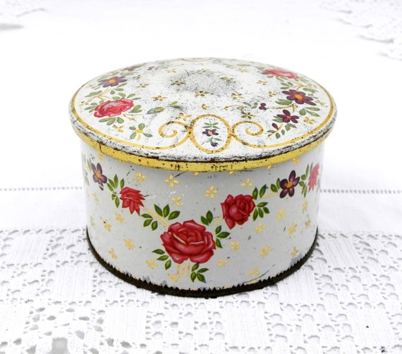 Antique French Metal Tin with Rose Floral Pattern/ Motif, Retro Vintage Shabby Romantic Home Decor, Country Cottage Boudoir Flower Box by VintageDecorFrancais