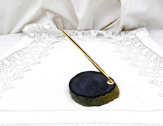 Vintage French Blue Veined Agate Onyx Nodule Stone Slab Pen Holder, Retro Mid Century Office Decor, Semi Precious Rock Desk Tidy, by VintageDecorFrancais