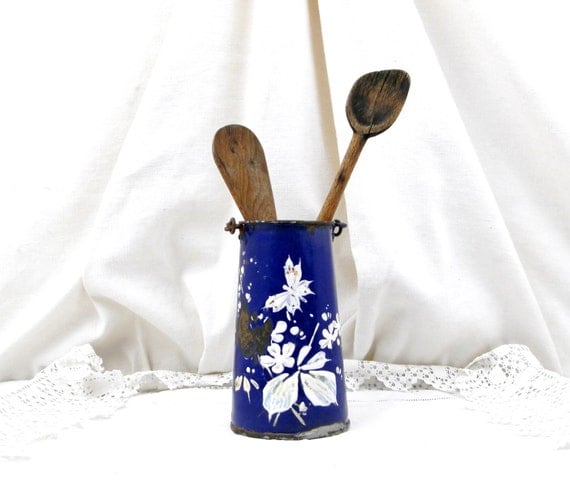 Antique French Early Enamelware Blue with White Hand Painted Flower and Butterfly Pattern Milk Pail / Churn, French Enamel Country Decor by VintageDecorFrancais