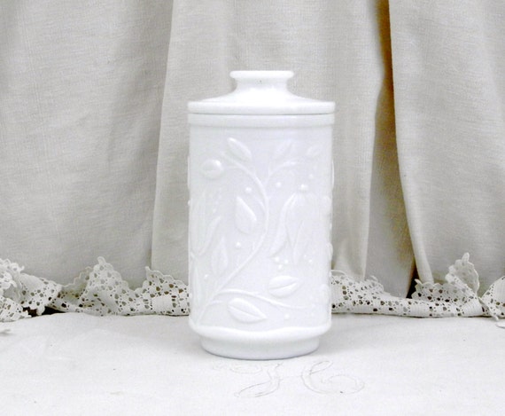 Vintage White Milk Glass Apothecary Decorative Jar with an Embossed Leaf Pattern, Opalex, Verre Opale, French Vintage Decor, Shabby Chic by VintageDecorFrancais