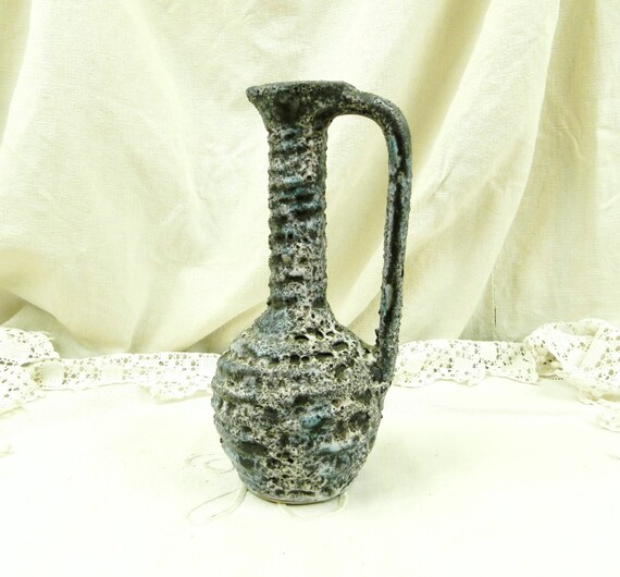 Vintage French Mid Century Black and White Lava Vase Jug, 1960s Vallauris Bubble Dark Glaze Ecume des Mers, 1950s Design Tall Necked Pot by VintageDecorFrancais