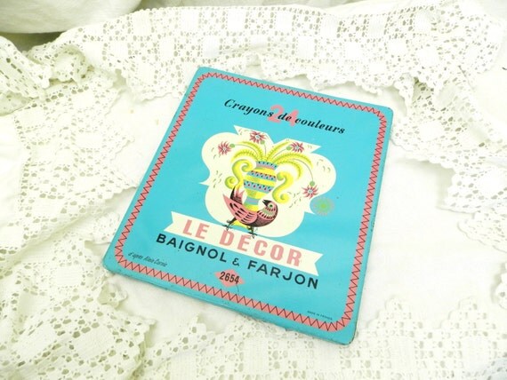 Vintage French Mid Century Blue and Pink Metal Box with 24 Colored Pencils / Crayons "Le Décor" Baignol and Farjon/ Vintage Craft Supplies by VintageDecorFrancais