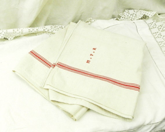 Excellent Condition Large Antique French Ecru Linen Tea Towel with Woven Red Stripes and 3 Small Red Cross Stitch Monogram M T R / Cottage by VintageDecorFrancais