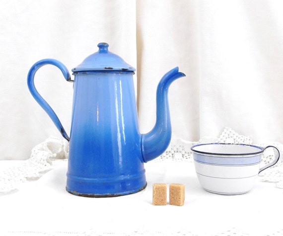 Antique 2 Tone Blue Enamelware Cafetière / Coffee Pot / French Country Decor / Retro Vintage Home Interior / kitchenalia Cottage Kitchen by VintageDecorFrancais