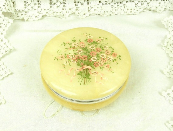 Vintage French Carved Hand Painted Alabaster Stone Lidded Powder Pot, Brocante Boudoir Box from France, Cosmetic Make Up Accessory by VintageDecorFrancais
