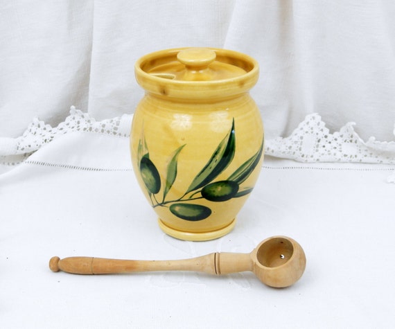 Vintage French Provencal Yellow Glazed Lidded Olive Pot with Serving Spoon / French Decor / Country Decor / Retro Home Interior Kitchenalia by VintageDecorFrancais