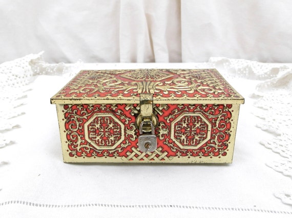 Vintage Chinese Inspired Red and Gold Colored Embossed Metal Tin with Tiny Working Padlock Manufactured for Outsider in Tourcoing France by VintageDecorFrancais