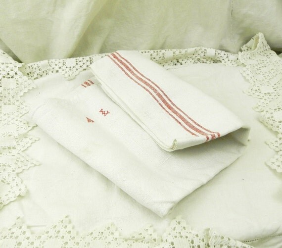 Large Antique French Linen Tea Towel with Woven Red Stripes and a 2 Small Red Cross Stitch Monogram A L / French Country Kitchen Decor by VintageDecorFrancais