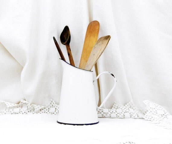 Small Sized Antique French White Enamelware Pitcher, Enamel Jug Vase, Cottage Kitchen, Farmhouse French Country Decor Rustic HomeChic by VintageDecorFrancais