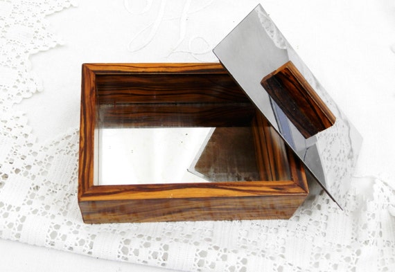Vintage French 1960s Mid Century Modern Veneered Wood and Stainless Steel Box with Mirrored Base, Retro 60s Jewelry Trinket Container by VintageDecorFrancais