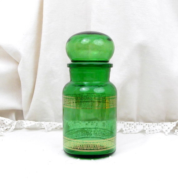 Vintage Green Glass Apothecary Decorative Jar, French Decor, Retro Home Interior, Storage Jar, Kitchen, Belgium, Canister, Gold Motif by VintageDecorFrancais
