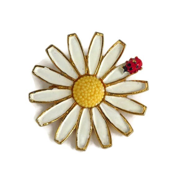 Weiss Daisy Brooch, Vintage White and Yellow Pin, Ladybug Pin, Signed Designer Jewelry, Gift idea, Gift Box by LeesVintageJewels