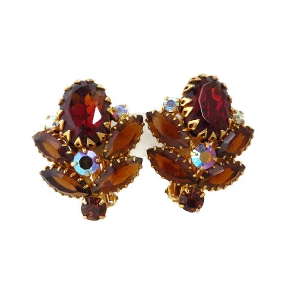 Juliana Amber Rhinestone Earrings | Vintage D&E Verified | Amber, Cognac, AB Rhinestone Clip-ons | Bridal Jewelry by LeesVintageJewels