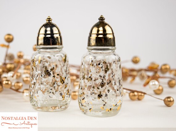Vintage Salt & Pepper Shakers | MCM Hazel Atlas Glass Gold / White Splatter Print by NostalgiaDenClassics