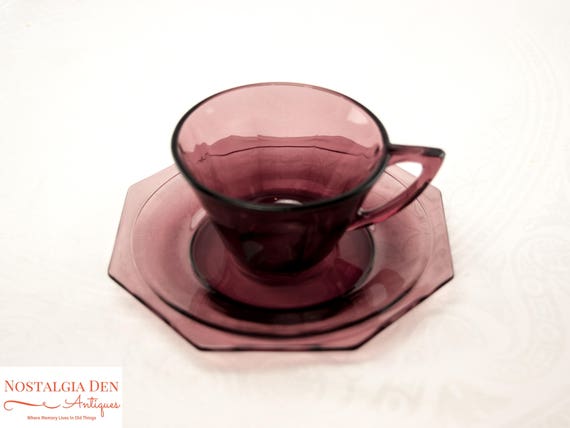 Purple Depression Glass Cup and Saucer Set | Moroccan Amethyst | Vintage Hazel Ware | Glass Cups and Saucers | MCM Kitchen Decor by NostalgiaDenClassics