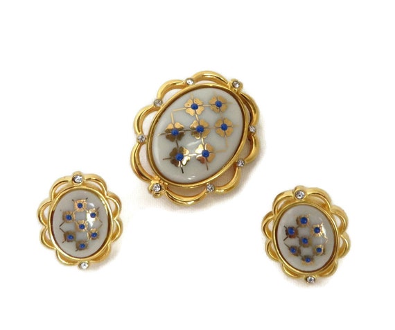 Lenox China Brooch, Earrings - Vintage Blue Dot Ivory China Demi Parure, Gift for Her, Gift Boxed by LeesVintageJewels