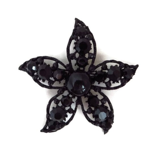 Weiss Mourning Brooch - Jet Black Glass, Rhinestone Flower Pin, Signed Designer Brooch by LeesVintageJewels