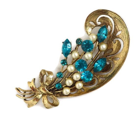 Vintage Brooch, Rhinestone Pin, Blue Rhinestone Faux Pearl Brooch, Vintage Weiss Gold Tone Flower Pin, Gift for Her by LeesVintageJewels