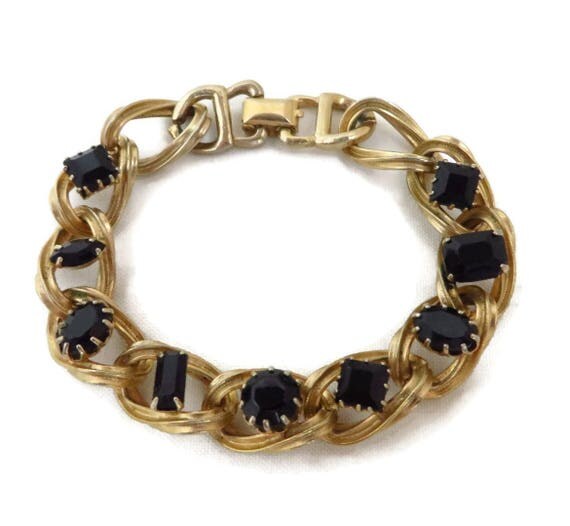 Black Rhinestone Bracelet - Vintage Gold Tone Chain Link Bracelet, Gift for Her by LeesVintageJewels