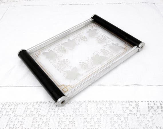 Antique Art Deco Glass Tray with Wooden Handles Gilt Banding and Decorated Vine Leaves and Grape Pattern, Retro Vanity Boudoir Accessory by VintageDecorFrancais