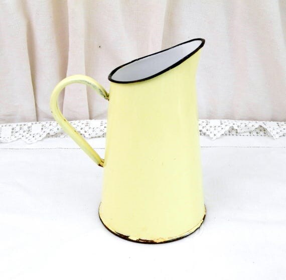 Antique French Buttercup Yellow Enamel Pitcher, Chippy Cottage Kitchen Enamelware Jug, French Country Chateau Shabby Chic, Vintage Decor by VintageDecorFrancais
