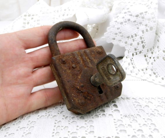 Large Heavy Vintage Working Industrial Rusty Metal Patina Padlock with 1 Working Key from France, French Retro Indust Home Interior Decor, by VintageDecorFrancais