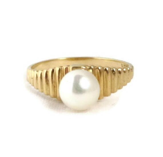 14K Gold Pearl Ring - Vintage Solitaire Pearl Ridged Gold Band Ring, Genuine Pearl Ring, Gift Idea, Size 6.5 by LeesVintageJewels