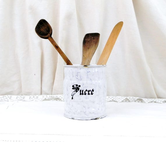 Antique French Chippy White and Blue Marbled Enamel Sugar Canister with Gothic Lettering, French Country Kitchen Enamelware Decor by VintageDecorFrancais