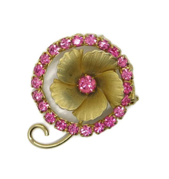 Pink Rhinestone Brooch, Vintage Gold Tone Floral Sparkly Circle Pin, Gift idea by LeesVintageJewels