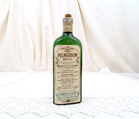 Antique French Cough Syrup "Pulmosérum" Medicine Green Glass Bottle with Original Paper Label from Paris, Apothecary, Belle Epoque France by VintageDecorFrancais