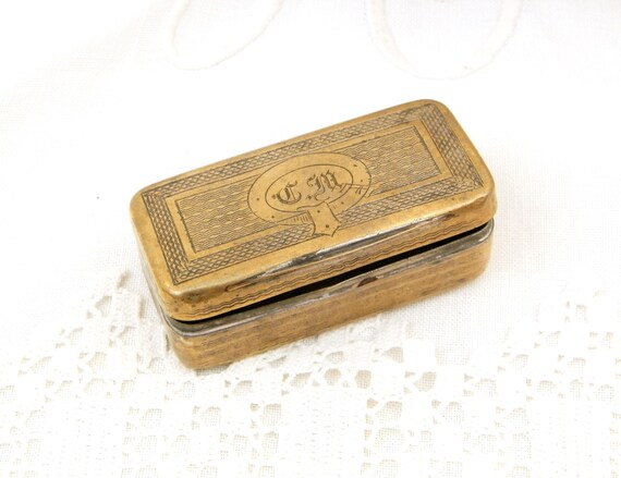 Antique French Victorian Rectangular Small Brass Box Engraved with the Monograms CM, Metal Snuff Box with Initials CM From France, Retro Tin by VintageDecorFrancais
