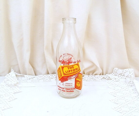 Vintage 1950s French Milk Bottle from a Dairy near Le Mans Advertising Lipton Tea in Orange and Red 1 L, 1960 Retro Kitchen, Cow And Yogurt by VintageDecorFrancais