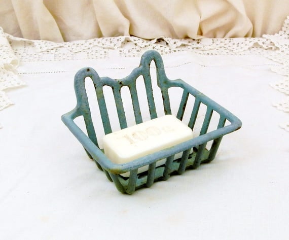 Large Antique Cast Iron Enameled Sky Blue Wall Hanging Soap Holder, French Blue Chippy Enamel Mural Soap Bar Dish, Enamelware Retro Bathroom by VintageDecorFrancais
