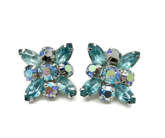 Weiss Sea Green AB Rhinestone Earrings, Vintage Rhinestone Silver Tone Clip-ons by LeesVintageJewels
