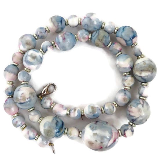 Vintage Blue Beaded Necklace - Blue and Pink Abstract Design Graduated Bead Necklace, Gift for Her by LeesVintageJewels