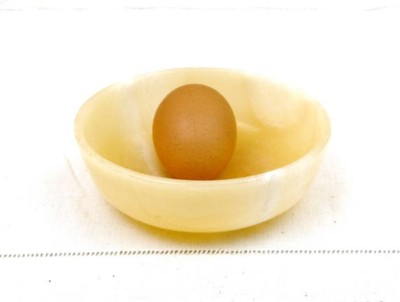 Vintage Carved Pale Yellow Veined Onyx Stone Bowl, Agate Trinket Vessel, Retro Vide Poche, by VintageDecorFrancais