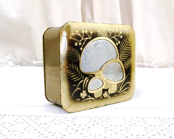 Vintage Mid Century Metal Tin with Inlaid Mushroom Pattern in Bronze, Gold and Silver Colors, French Decorative Metal Box and Fungi Motifs by VintageDecorFrancais