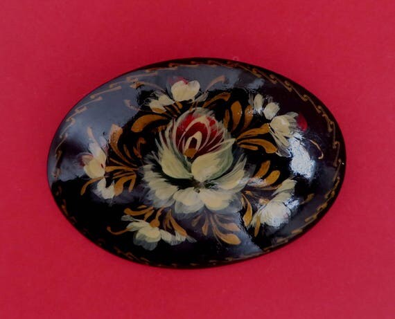 Vintage Hand Painted Russian Brooch, Oval Black Lacquered Pin by LeesVintageJewels