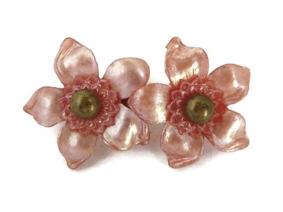 Vintage Brooch - Art Deco Celluloid Brooch, Pink Frost Carved Double Flower Pin, Gift for Her, Gift Box by LeesVintageJewels