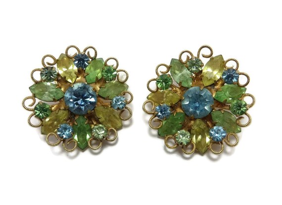 Weiss Flower Rhinestone Earrings, Vintage Green Yellow Blue Earrings, Signed Weiss Jewelry by LeesVintageJewels