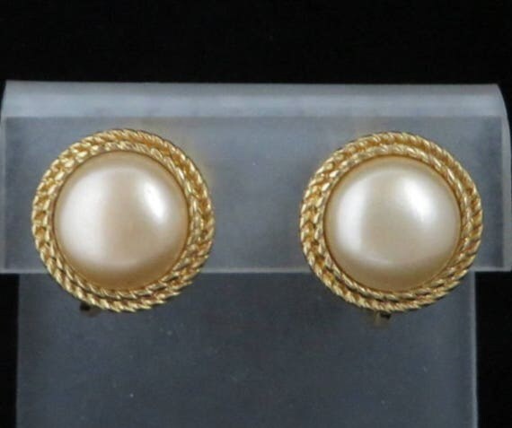 Crown Trifari Faux Pearl Earrings Vintage Braided Gold Tone Button Clip-ons Estate Costume Jewelry Designer Signed Clips by LeesVintageJewels