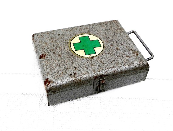 Vintage French Mid Century Metal First Aid Grey Tin, Industrial, Retro, Home, Interior, Brocante, Hipster, Medical, Nursing, Green Cross by VintageDecorFrancais