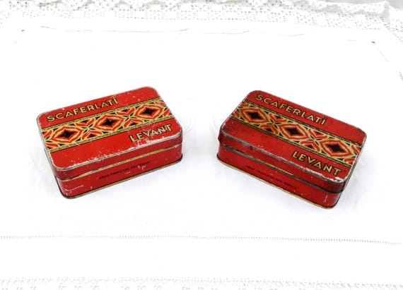 2 Vintage French Matching Metal Tobacco Tins "Scaferlati Levant" Red and Gold Graphics and Pattern, French Decor, Matching Pair, Retro Tin by VintageDecorFrancais