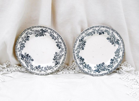 2 Antique French H.B.C.M China Dessert Plates with Dark Blue Transferware Wild Rose Pattern, Chateau, Chic, French Country Decor, Cottage by VintageDecorFrancais