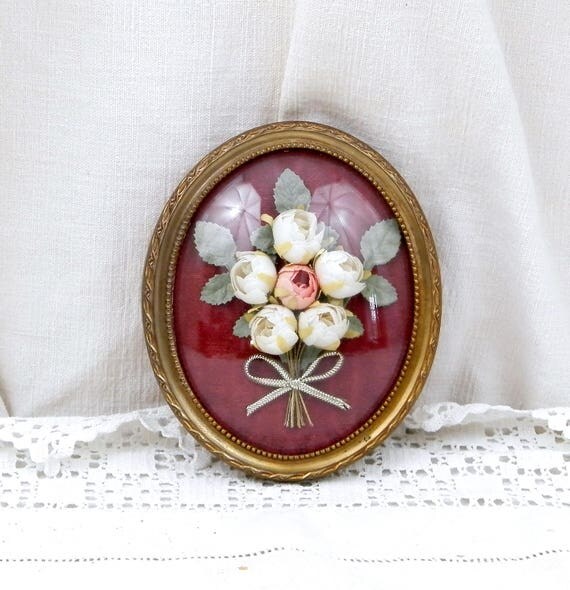 Vintage French Domed Glass and Brass Picture Frame with Silk Flower Composition on Satin Backing, Wall Hanging, Mid Century, 1950s, 1960s by VintageDecorFrancais